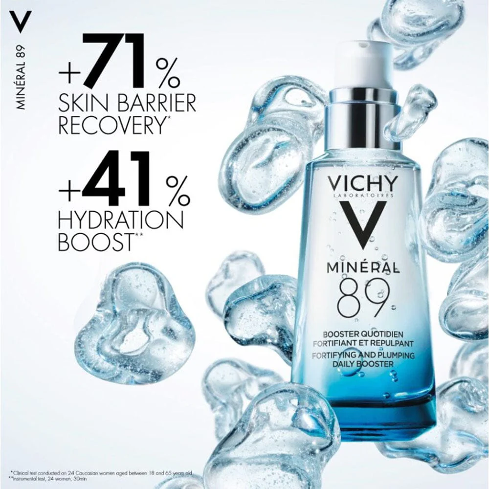 سرم آبرسان و تقویت کننده پوست مینرال ۸۹ برند Vichy یک آبرسان ضد حساسیت، ایمن و موثر برای انواع پوست است. این آبرسان ویشی اثربخشی فوری دارد و موجب ۲۴ %ارائه رطوبت شدید و ۲۱% اثر پر و حجیم شدن مجدد پوست می شود. به علاوه بر اساس نتایج بالینی موجب کاهش۶۴% خشکی و۶۸% قرمزی و۹۳% سوزش پوست می گردد.