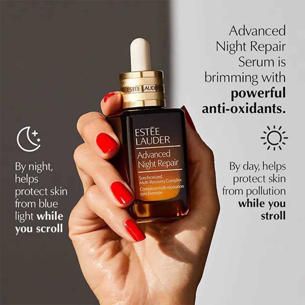 سرم شب ترمیم کننده استی لادر مدل ادونس نایت ریپیر برای جوانسازی پوست و کاهش علائم پیری تولید شده است.
